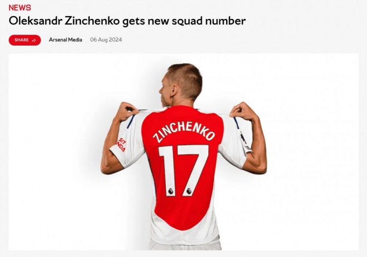阿森纳在8月6日官方宣布,津琴科将更换球衣号码,从原来的35号改穿17号。值得一提的是,乌克兰国脚在代表国家队参赛时一直穿的就是17号球衣。此前,17号球衣属于塞德里克-苏亚雷斯,但这名后卫在今年夏天离开了阿森纳,17号球衣便变成了空缺状态。