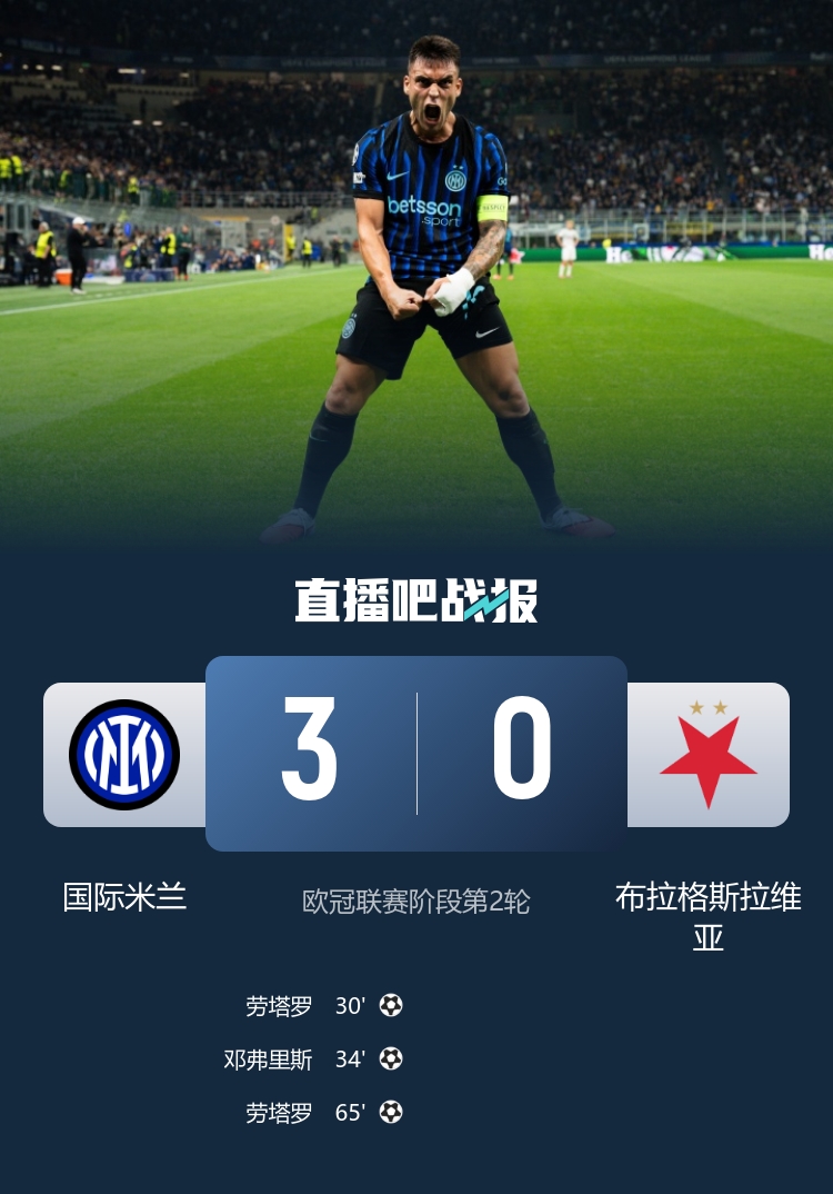国米以3-0战胜布拉格斯拉维亚 职业联赛实现欧冠两连胜 劳塔罗梅开二度邓弗里斯助攻得分_欧冠直播在线直播观看