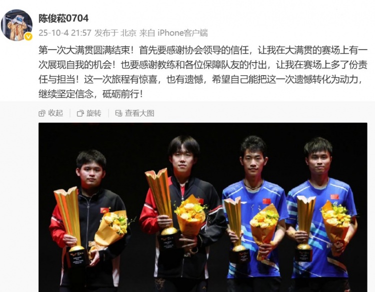 10月4日讯,中国乒乓球运动员陈俊崧在社交媒体上回顾了本届WTT中国大满贯赛事,表达了自己的感受和收获。他在文中表示:“这是我第一次参与大满贯赛事,圆满结束这一阶段让我感到无比振奋。首先,我要感谢协会领导对我的信任,让我得以在这样的重要舞台上展示自我;同时也要感激我的教练以及各位保障队友的辛勤付出,让我在赛场上增添了更多的责任感与担当。”