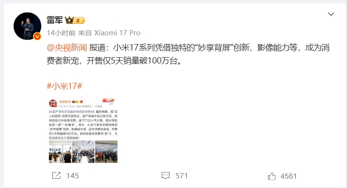 小米17系列手机在市场上取得了颇为瞩目的成就,仅仅开售5天就突破了100万台的销量,甚至连雷军本人都对此进行了确认并转发发布的消息。