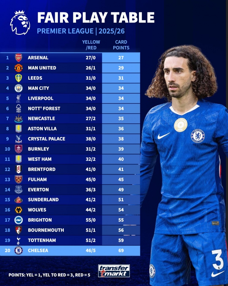 根据德国转会市场的统计数据,本赛季英超联赛的各队在吃牌方面的表现有明显差异,其中阿森纳的黄牌积分最少,仅为27分,而切尔西则以69分高居榜首,展现了其在场上的激烈拼抢和防守风格。