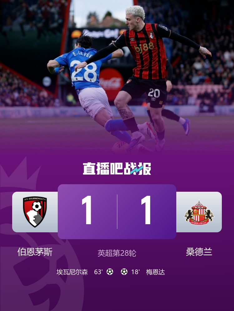 伯恩茅斯与桑德兰握手言和 梅恩达进球埃瓦尼尔森扳平_英超直播
